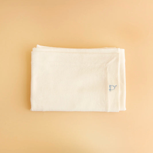 Užklotėlis su žydru siuvinėtu logotipu kraštelyje