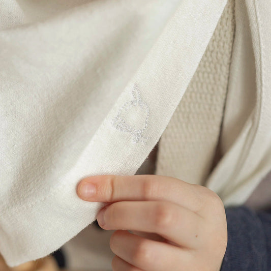 Kaklaskarė Skarulis su melsvu siuvinėtu logotipu kraštelyje