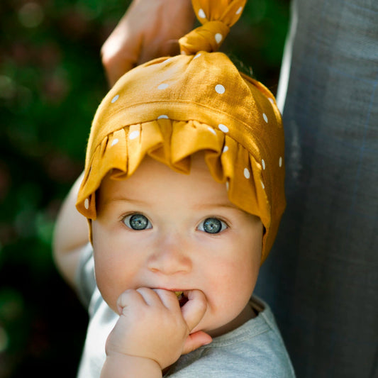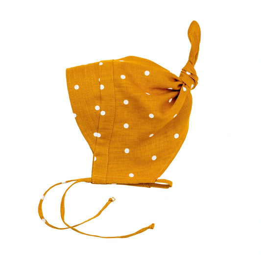Garstyčių spalvos, baltais burbuliukais marginta kepurė Čiubas su raukiniu
